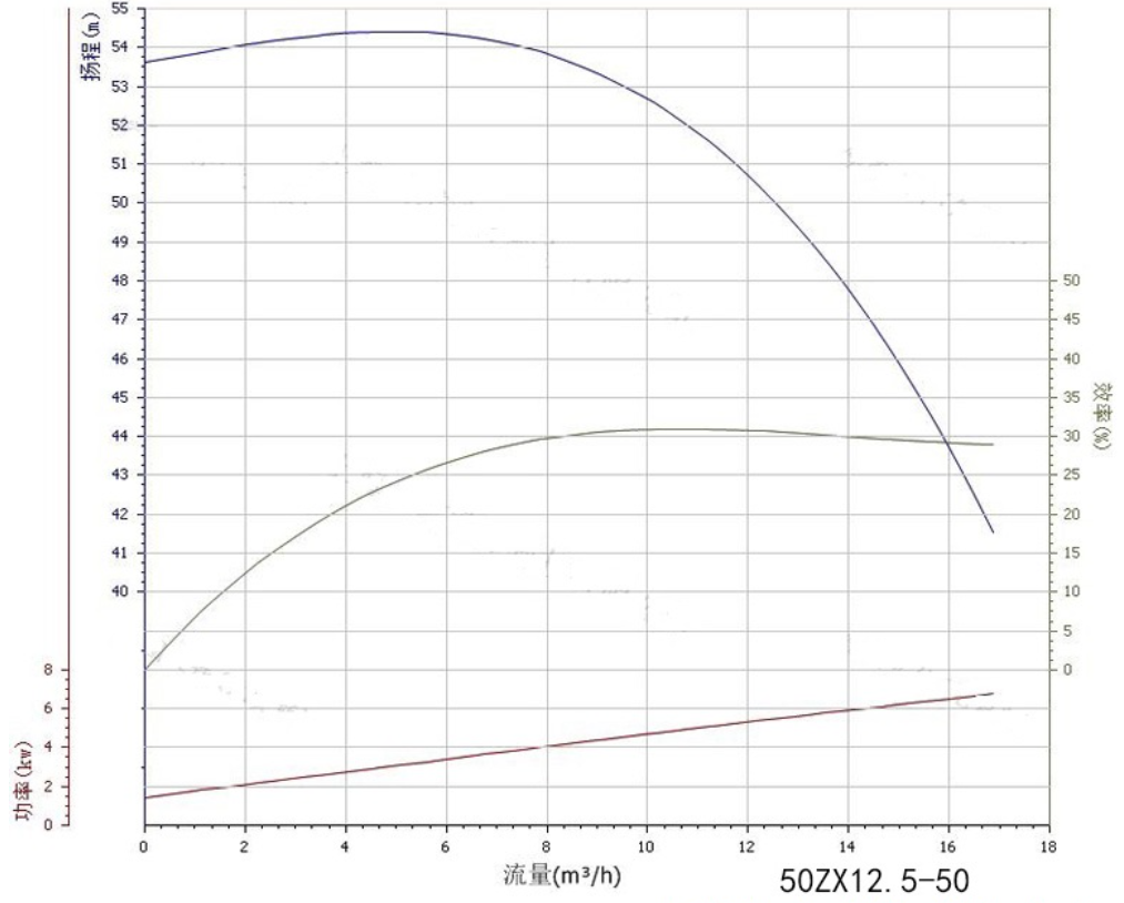 50ZX12.5-50自吸泵型號前面的50代表進出口口徑為50mm、ZX表示為自吸式離心泵、12.5代表額定流量12.5立方米每小時、50表示泵的額定揚程50米、自吸高度為5米,配用5.5KW功率電機。如果用戶要求吸程較高,還可以加裝真空輔裝置,做成吸程可達9米的高吸程自吸泵。應當注意的是,因為自吸泵參數是使用清水測試而得出的,但在使用中會因為輸送介質的粘度及管道損耗等原因,導致實際使用中流量、壓力參數減小。所以在選型的時候應當留有一些余量,尤其在工況要求揚程必須達到50米時,建議選大一個自吸泵型號,選擇50ZX15-60自吸離心泵使用。
